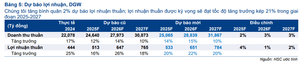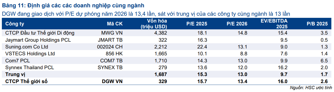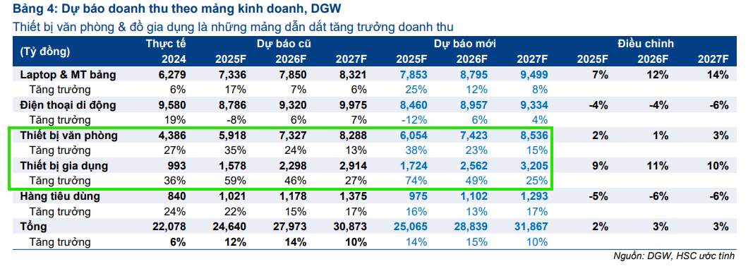 HSC (19.11.2025) dự báo doanh thu của DGW trong năm 2025 và 2026 lần lượt đạt 25,065 tỷ đồng (+14% YoY) và 28,839 tỷ đồng (+15% YoY). Lợi nhuận thuần tương ứng dự kiến đạt 533 tỷ đồng (+20% YoY) và 651 tỷ đồng (+22% YoY). Động lực tăng trưởng chính đến từ mảng thiết bị văn phòng hưởng lợi trực tiếp từ nhu cầu đầu tư hạ tầng CNTT gia tăng, cùng với mảng thiết bị gia dụng tăng mạnh nhờ mở rộng danh mục và sự ra mắt loạt sản phẩm lớn của Xiaomi. Mảng laptop duy trì đà tăng ổn định theo nhu cầu nâng cấp thiết bị, trong khi mảng điện thoại di động chững lại nhưng vẫn có điểm tựa từ thương hiệu Motorola.