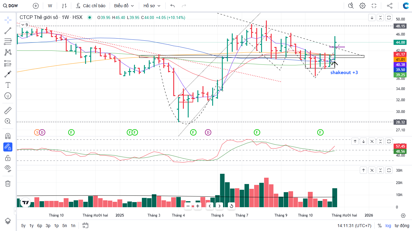 Trên đồ thị kỹ thuật, DGW đang có RS=87, mức hoạt động tốt trên thị trường. Sau khi điều chỉnh gần 27% từ đỉnh, DGW đã sớm xây nền và hình thành mẫu hình 2 đáy. Sau khi xuất hiện điểm mua Shakeout +3 vào ngày 17/10, cổ phiếu đã thành công breakout trendline và tiến gần với điểm pocket pivot tại giá 45,700 đồng. Trong nhóm bán lẻ, Elibook Team ưu tiên đánh MWG và FRT, không cầm DGW, PNJ hay MSN, nhưng các cổ phiếu nhóm bán lẻ cùng phục hồi sẽ bổ trợ cho giá cổ phiếu, dĩ nhiên, các trader quan tâm vẫn có thể quan sát DGW quanh giá 42,000-43,000 đồng.