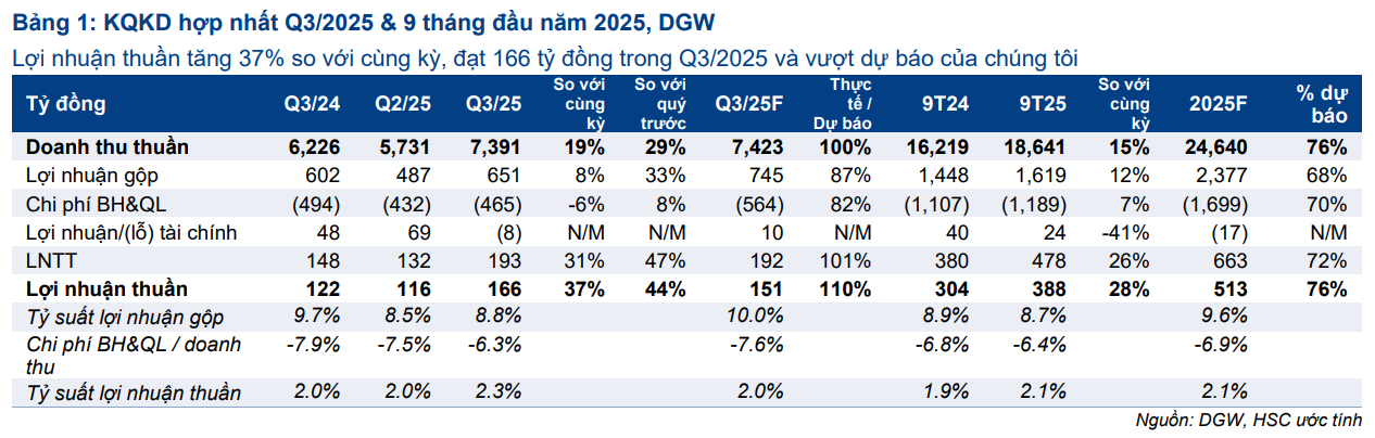 Kết quả quý 3/2025 của DGW thể hiện sự phục hồi rõ rệt trên toàn bộ các mảng trọng tâm. Doanh thu thuần đạt 7,391 tỷ đồng (+19% YoY). Lợi nhuận thuần đạt 166 tỷ đồng, tăng 37% và vượt 10% dự báo của HSC.