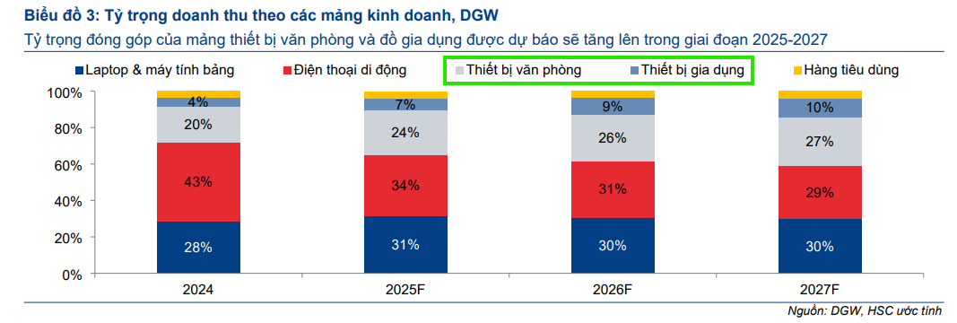 Ngược lại, điện thoại di động, mảng từng chiếm tỷ trọng lớn nhất, đang chững lại do cạnh tranh gay gắt ở phân khúc Android và sự mất thị phần sản phẩm Apple vào tay các nhà bán lẻ khác. HSC dự báo doanh thu điện thoại giảm 12% trong 2025 và chỉ tăng nhẹ ở mức 6% và 4% trong hai năm tiếp theo. Motorola, thương hiệu mới do DGW phân phối độc quyền, được xem là yếu tố tiềm năng nhưng đóng góp được dự báo chưa đáng kể trong ngắn hạn.