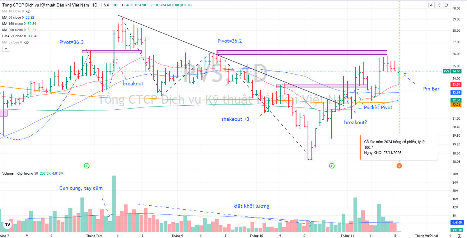 Trên đồ thị, RS của PVS là 75, nằm trong số các cổ phiếu hoat động tốt trên thị trường. Nhà giao dịch có thể mua PVS khi chuẩn bị breakout điểm pivot=36,200 của mẫu hình Hai Đáy. Điểm mua sớm có thể xuất hiện khi PVS kiểm tra EMA 21 ngày bởi các Pin Bar, quanh vùng giá 34,600