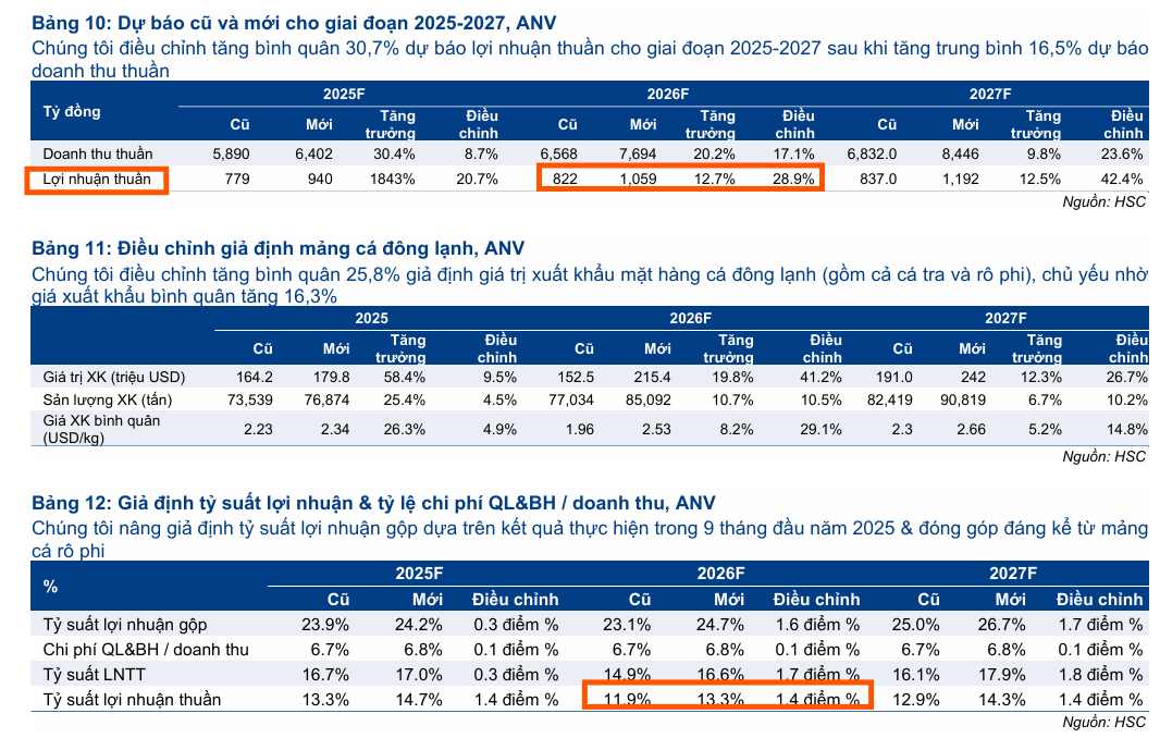 Để phản ánh kết quả hoạt động vượt trội và triển vọng tích cực, Công ty Chứng khoán TP.HCM (HSC) đã điều chỉnh tăng bình quân 30.7% dự báo lợi nhuận thuần giai đoạn 2025-2027 của ANV. Dựa trên cơ sở đó, HSC (20.11.2025) duy trì khuyến nghị Mua vào đối với cổ phiếu ANV, với giá mục tiêu được điều chỉnh tăng 28% lên mức 36,100 đồng.