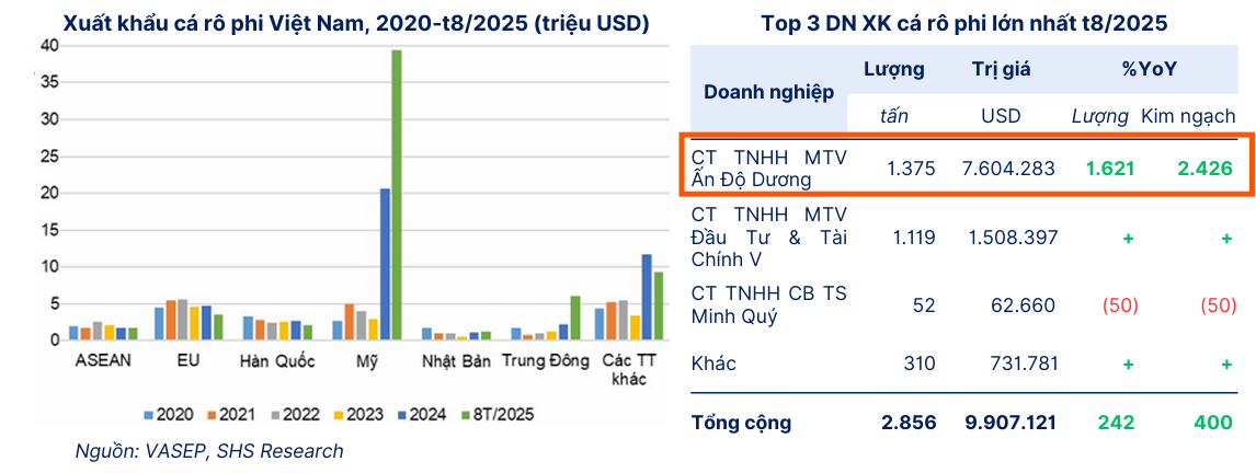 • Xuất khẩu cá rô phi tăng vọt: Doanh thu xuất khẩu cá rô phi tăng 328% YoY, chiếm 30% tổng giá trị xuất khẩu; riêng thị trường Mỹ tăng 388%, chiếm 85% giá trị xuất khẩu sang Mỹ.