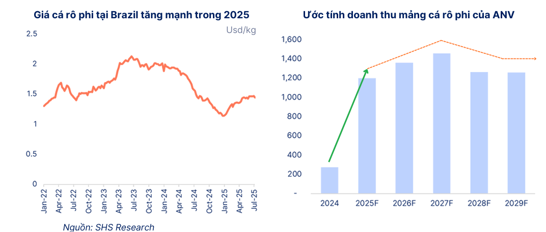 Trước những điều kiện thuận lợi này, ANV đã nhanh chóng mở rộng thị trường, không chỉ ký kết đơn hàng với các nhà bán lẻ lớn tại Mỹ như Walmart, Costco, mà còn thiết lập thỏa thuận hợp tác chiến lược với các doanh nghiệp nhập khẩu thực phẩm tại Brazil, mở đường tiến sâu vào thị trường Nam Mỹ hơn 200 triệu dân. Hiện tại, ANV đã chuyển đổi hơn 70% diện tích ao nuôi tại Bình Phú sang nuôi cá rô phi và có kế hoạch nâng công suất chế biến. Ước tính doanh thu cá rô phi năm 2025 của ANV sẽ đạt 1,200 tỷ đồng, tăng hơn 4 lần so với cùng kỳ, với biên lợi nhuận gộp khoảng 33%, dự kiến đóng góp gần 400 tỷ đồng lợi nhuận.