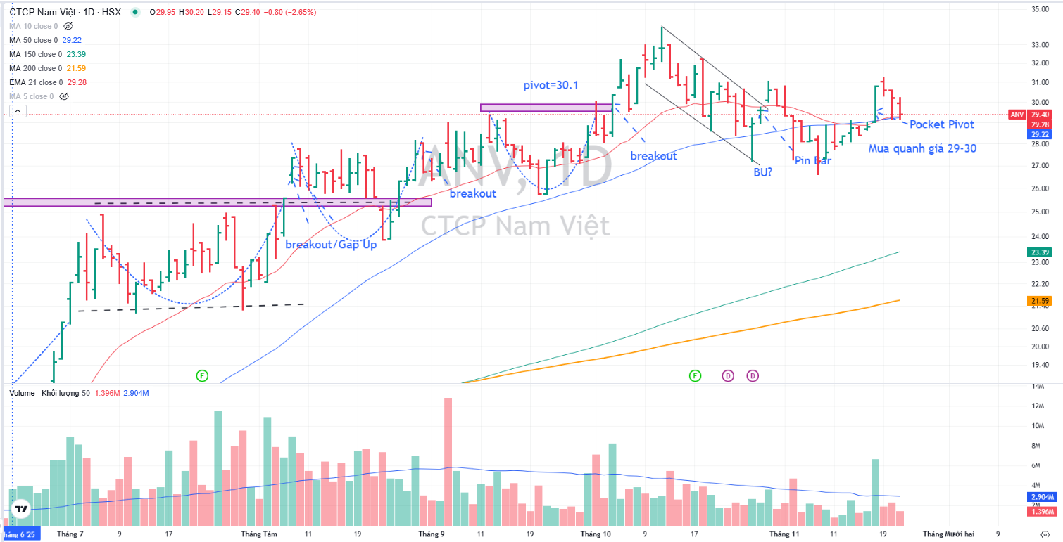 Trên đồ thị, RS của ANV là 96, hoạt động tốt vượt trội trên thị trường. ANV có điểm mua Pocket Pivot vào ngày 18.11.2025, quanh vùng giá 29,000-30,000 đồng. Hiện ANV đang kéo về vùng giá này với thanh khoản thấp, mang tới cơ hội bổ sung vị thế.