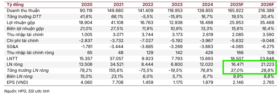 Sau KQKD Q3/2025, SSI (4.11.2025) nâng giá mục tiêu của HPG lên 35,000 đồng/cổ phiếu từ mức giá mục tiêu 33,000 đồng trước đó. Các yếu tố có thể hỗ trợ tích cực đối với giá cổ phiếu gồm: lợi nhuận Q4/2025 tăng mạnh 47% yoy, IPO công ty con HPA (Nông nghiệp Hòa Phát), và giá thép phục hồi vượt kỳ vọng. Mặc dù vậy, SSI điều chỉnh giảm dự báo LNST năm 2025 xuống 16,00 tỷ đồng (từ 17,100 tỷ đồng), tăng 37% yoy, do giả định sản lượng thép xây dựng và HRC thấp hơn. Đồng thời, điều chỉnh giảm dự báo LNST 2026 xuống 21,200 tỷ đồng (từ 22 nghìn tỷ đồng), tăng 29% yoy.