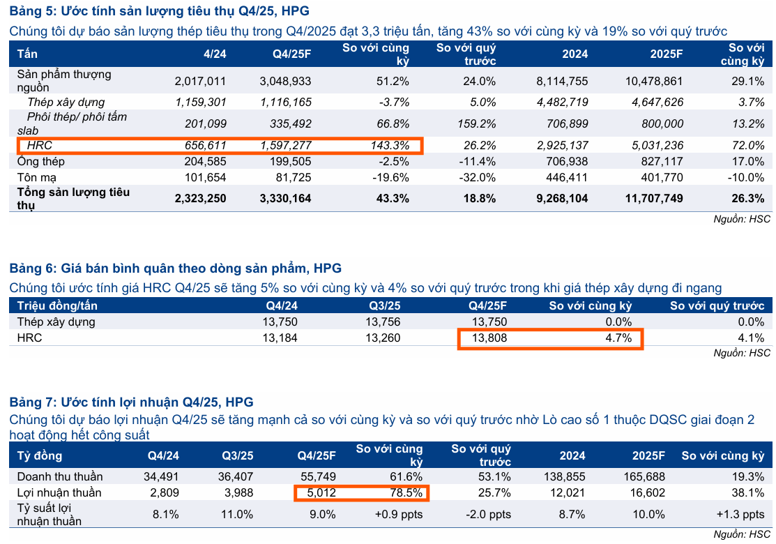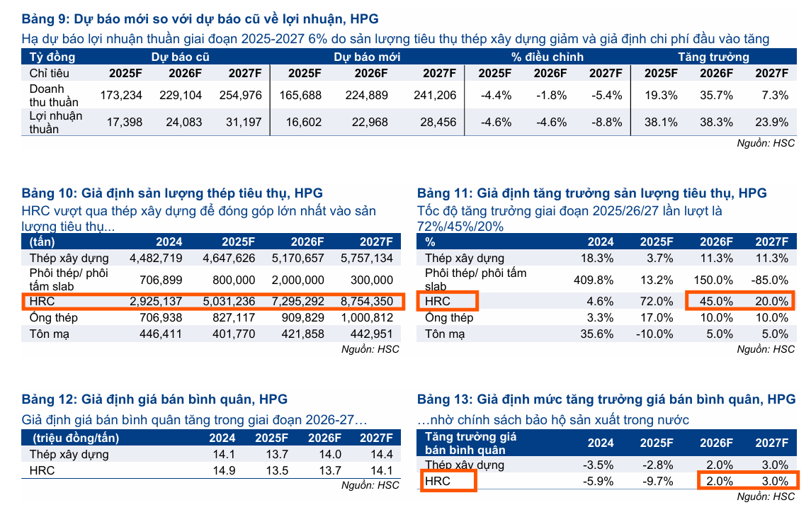 BSC (3.11.2025) cũng duy trì khuyến nghị Mua vào với giá trị hợp lý năm 2026 là 33,170 đồng/cổ phiếu (tiềm năng tăng giá 24%). BSC cho rằng điểm rơi lợi nhuận của HPG sẽ diễn ra vào nửa đầu năm 2026 sau khi Việt Nam thông qua áp thuế chống lẩn tránh đối với HRC khổ lớn (kỳ vọng vào quý 1/2026). BSC giữ nguyên dự báo lợi nhuận năm 2025 ở mức 17,153 tỷ đồng và dự báo lợi nhuận năm 2026 là 25,462 tỷ đồng, kỳ vọng vào sự ổn định của DQSC2 và khả năng tăng giá HRC của HPG trong quý 1/2026.