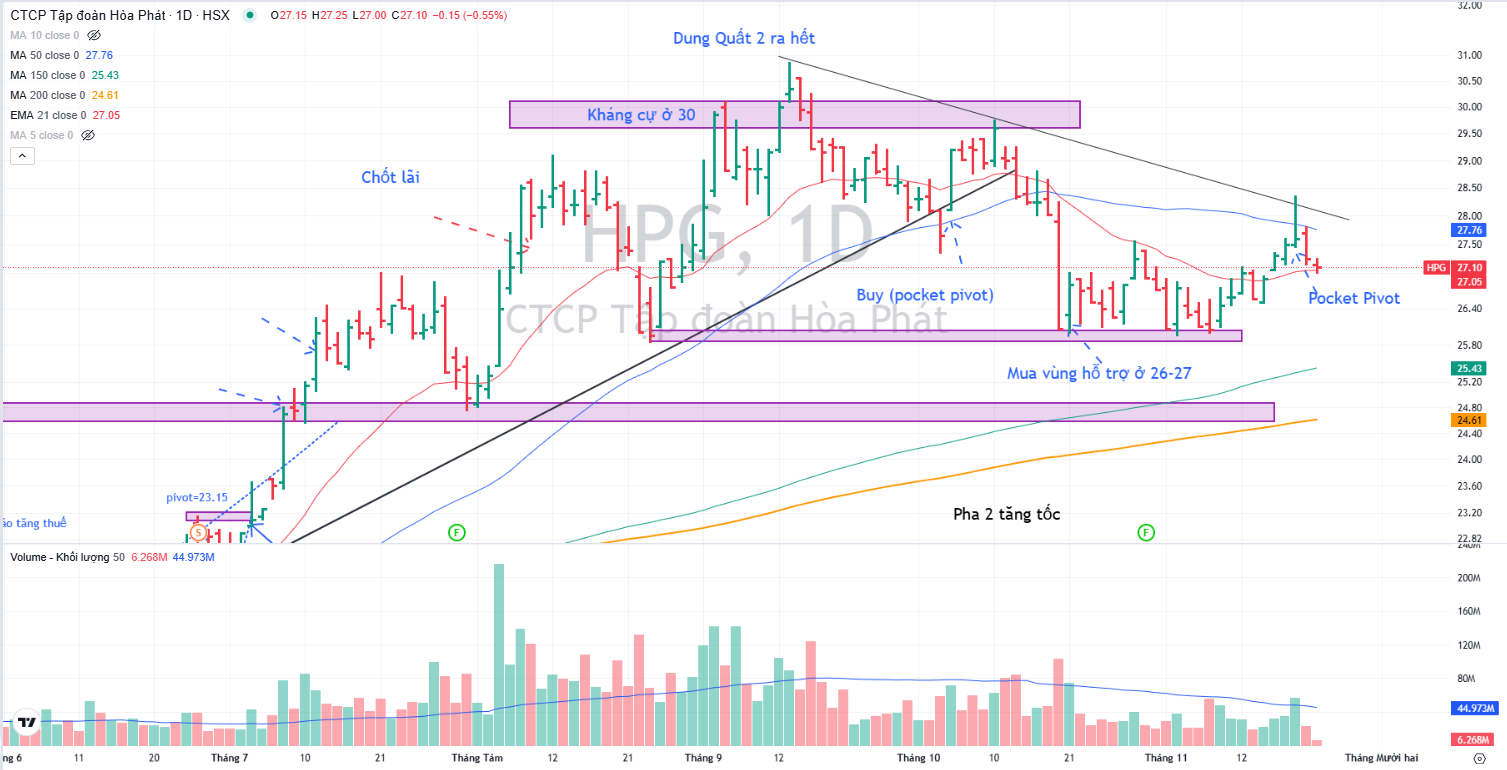Trên đồ thị, RS của HPG là 76 hoạt động khá tốt trên thị trường. Elibook Team khuyến nghị mua HPG ở vùng giá 26-27,000 đồng, và không nên mua rượt đuổi quá giá 28,000 đồng.