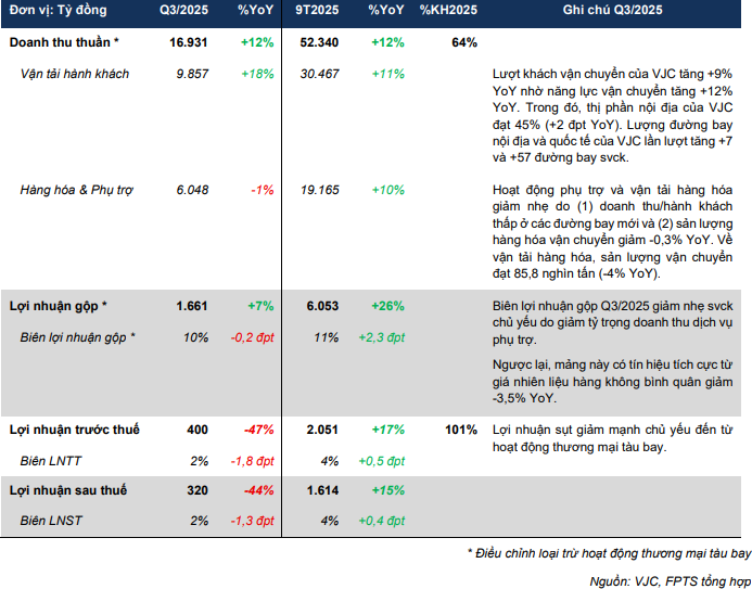 Trong quý 3/2025, VJC ghi nhận doanh thu thuần 16,931 tỉ đồng (+12% YoY). Lợi nhuận gộp đạt 1,661 tỉ đồng (+7% YoY), phản ánh năng lực khai thác tiếp tục gia tăng khi đội bay được mở rộng và giá nhiên liệu hàng không giảm. Năng lực vận chuyển tăng +12% YoY, giúp lượt khách tăng +9% YoY và thị phần nội địa đạt mức 45%, tăng 2 điểm % YoY.