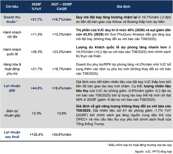 Giai đoạn 2026-2029, triển vọng tăng trưởng của Vietjet được dẫn dắt bởi đội bay mở rộng, nhu cầu du lịch quốc tế đi lên và biên lợi nhuận được cải thiện. Doanh thu vận tải hàng không năm 2026 dự kiến tăng +21.7% YoY và duy trì mức tăng trưởng bình quân +18.7%/năm cho giai đoạn 2027-2029. Lợi nhuận sau thuế dự kiến tăng +132.4% YoY trong năm 2026 và duy trì mức tăng bình quân +24.8%/năm.
