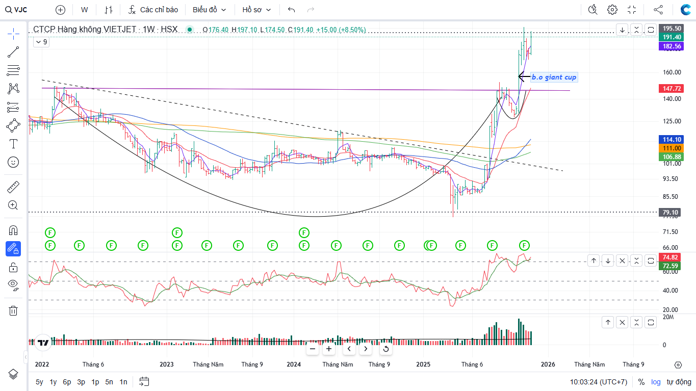 Trên biểu đồ kỹ thuật, VJC có RS=99, mức hoạt động tốt trên thị trường. Elibook Team không khuyến nghị đánh cổ phiếu hàng không, nhưng khả năng cao nhà Chị Thảo và nhà Bác Vượng tiếp tục đóng vai trò dẫn dắt thị trường uptrend, bao gồm cả HDB.