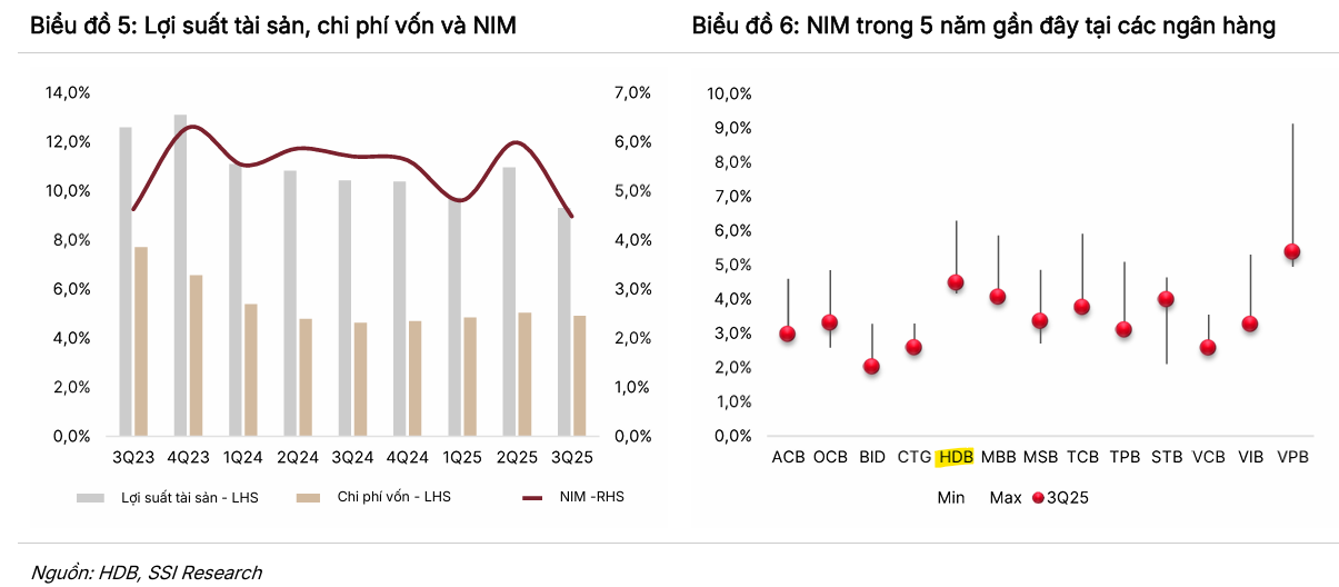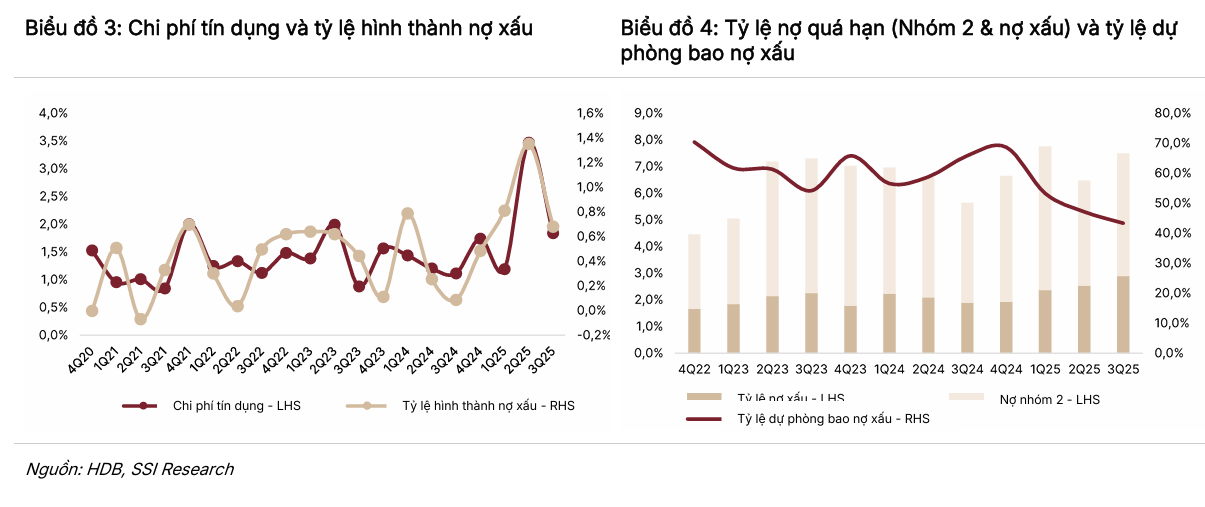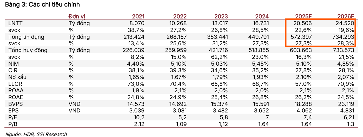 SSI ước tính Lợi nhuận trước thuế (LNTT) của HDB có thể đạt 20,500 tỷ đồng (tăng 22.6% so với cùng kỳ) trong năm 2025 và 24,500 tỷ đồng (tăng 19.6%) trong năm 2026. Đà tăng trưởng lợi nhuận được kỳ vọng sẽ tăng tốc mạnh mẽ ngay trong Quý 4/2025, với LNTT dự báo đạt 5,700 tỷ đồng (tăng 40% so với cùng kỳ), được hỗ trợ bởi tăng trưởng tín dụng mạnh hơn, chất lượng tài sản cải thiện và sự phục hồi của thu nhập phí.