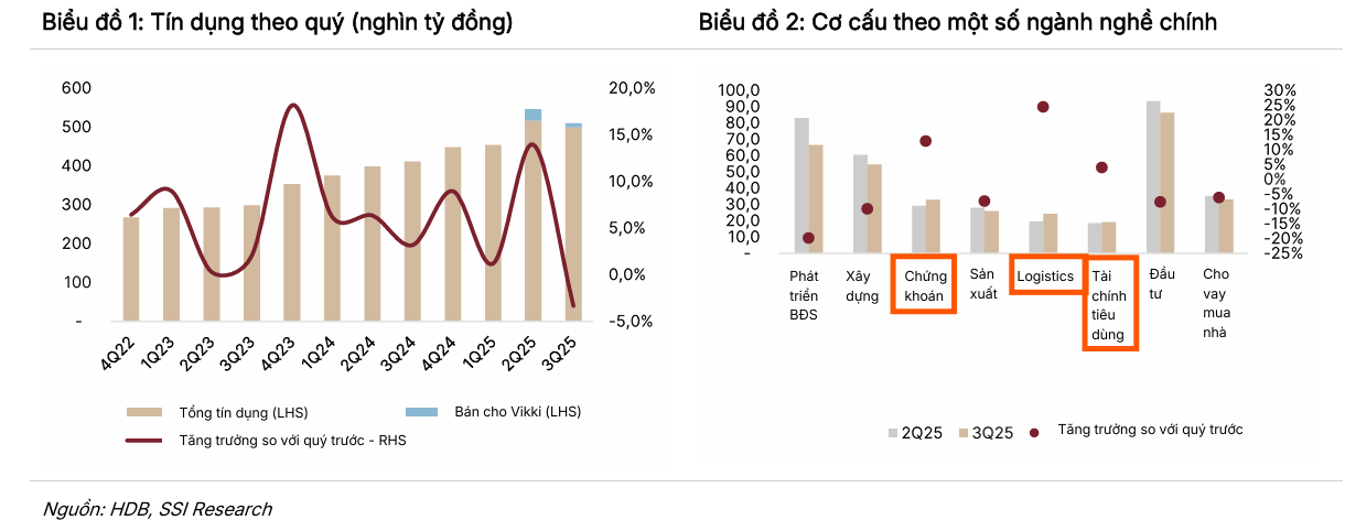 Phân tích sâu hơn về Quý 3/2025 cho thấy, tổng dư nợ tín dụng của HDB đạt 500,400 tỷ đồng, tăng 11.5% so với đầu năm nhưng ghi nhận sự sụt giảm hiếm thấy 3.3% so với quý trước.