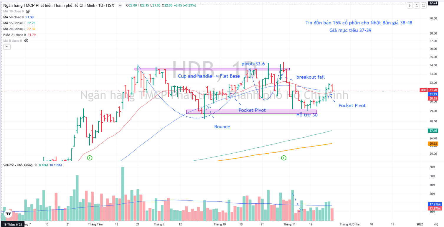 Sau khi breakout thất bại mẫu hình Chiếc Cốc Tay Cầm vào ngày 30 tháng 10 do thị trường chung chuyển xấu, HDB đã sớm tăng giá trở lại và có điểm mua Pocket Pivot vào ngày. Elibook Team khuyến nghị mua HDB quanh vùng giá 30,000 đồng.