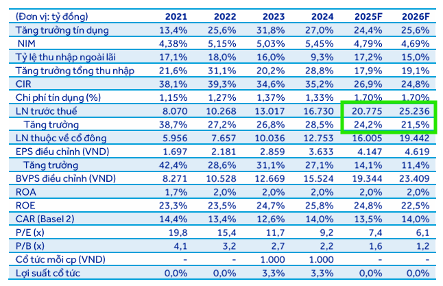 ACBS dự phóng LNTT năm 2025 tăng trưởng 24.2% yoy, đạt 20,775 tỷ đồng, và tiếp tục tăng trưởng 24.5% năm 2026, đạt 25,236 tỷ đồng. Điều này dựa trên kịch bản năm 2026, tăng trưởng tín dụng 25.6%, NIM giảm 10 điểm cơ bản xuống còn 4.69% và chi phí trích lập dự phòng tăng 25% yoy.