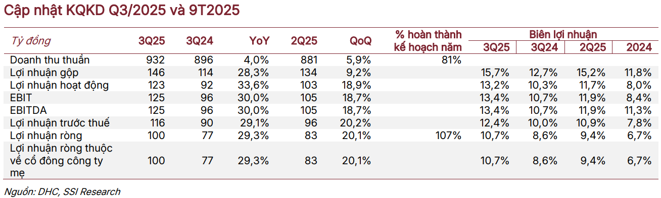 DHC dự kiến tiếp tục duy trì kết quả tích cực trong quý 4 năm 2025 dù tốc độ tăng trưởng có thể chậm lại sau cao điểm nhu cầu B2B. Doanh thu quý 4 được dự báo đạt 985.6 tỷ đồng (+12.9% YoY), biên lợi nhuận gộp duy trì 15.7%, lợi nhuận trước thuế đạt 116 tỷ đồng và lợi nhuận ròng đạt 9.,9 tỷ đồng, tương đương biên lợi nhuận ròng 10.0%.