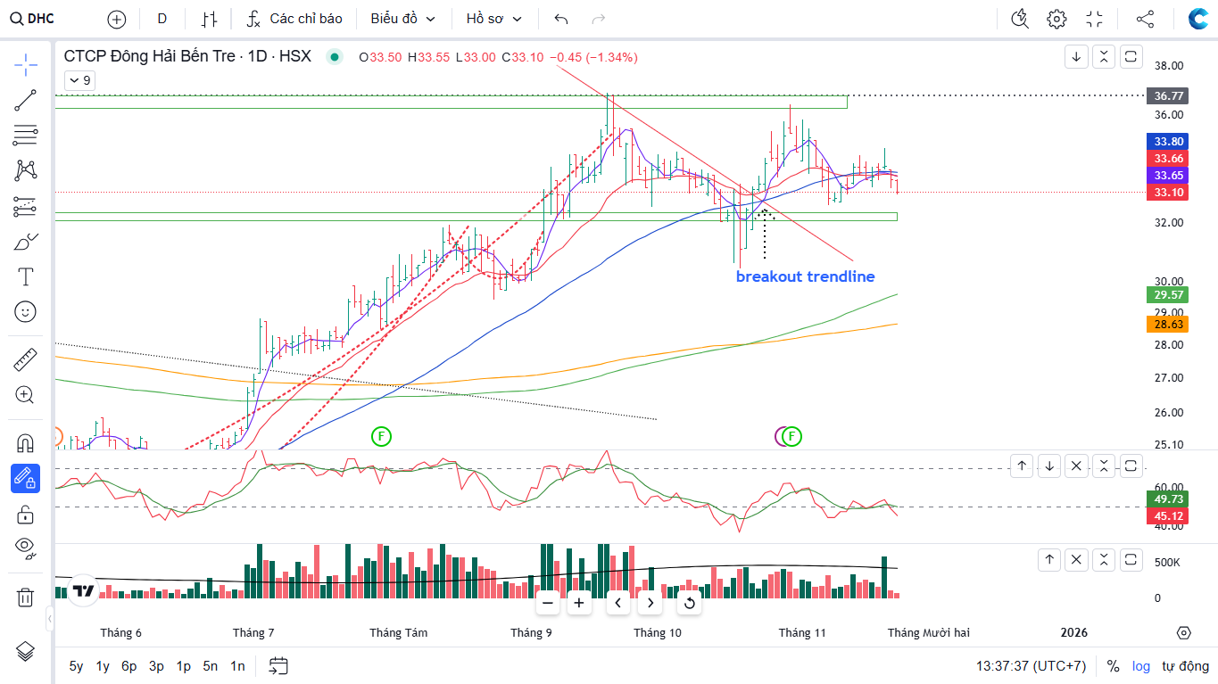 Trên biểu đồ kỹ thuật, DHC có RS=61.2, mức hoạt động trung bình trên thị trường. Sau khi breakout không thành công ngày 30/10/2025, cổ phiếu quay lại xây nền giá phẳng, đang kiểm chứng phiên breakout trendline ngày 24/10 với thanh khoản cạn kiệt. DHC đánh lẻ và không có sự bổ trợ của nhóm ngành, chất xúc tác lớn nhất vẫn là kết quả kinh doanh tăng trưởng ổn định.Tuy nhiên, việc liên tục breakout failed tại vùng đỉnh + vol bán lớn là dấu hiệu cho thấy cổ phiếu vẫn chưa sẵn sàng tăng giá, và cần về vùng giá phù hợp hơn cho sóng tăng sau đó.