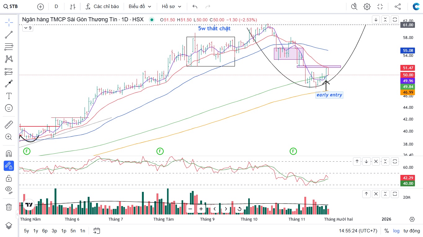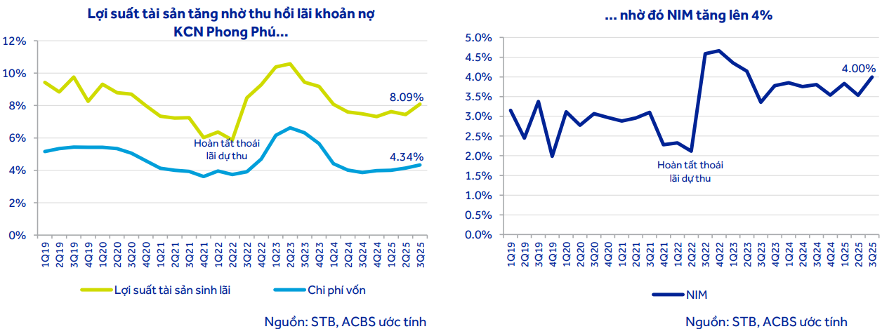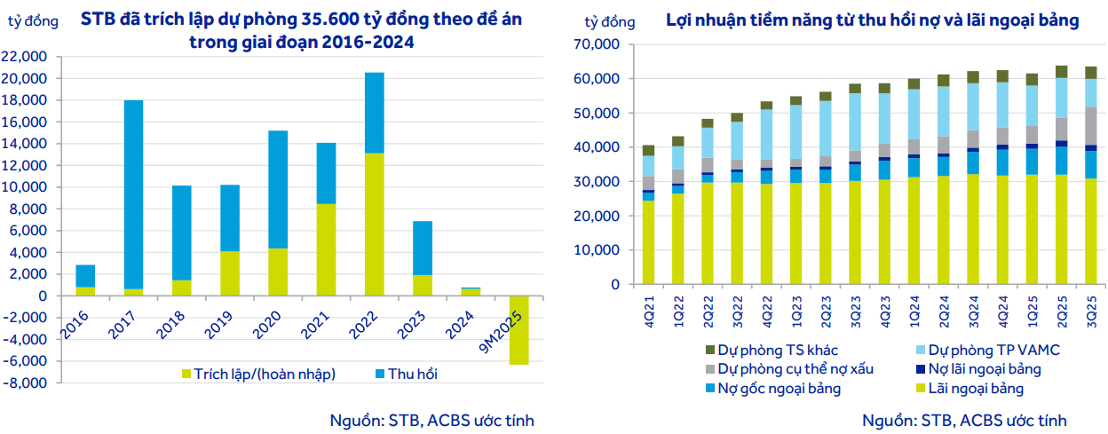 - Báo cáo cập nhật của ACBS ngày 21/11/2025 cho thấy bức tranh rõ ràng về khả năng phục hồi lợi nhuận của ngân hàng trong bối cảnh khoản nợ được bảo đảm bằng 32.1% cổ phần STB chưa được xử lý xong nhưng gần điểm hoàn tất. Giá mục tiêu là 57,000 đồng (upside +15.2% từ giá 49,500 đồng).