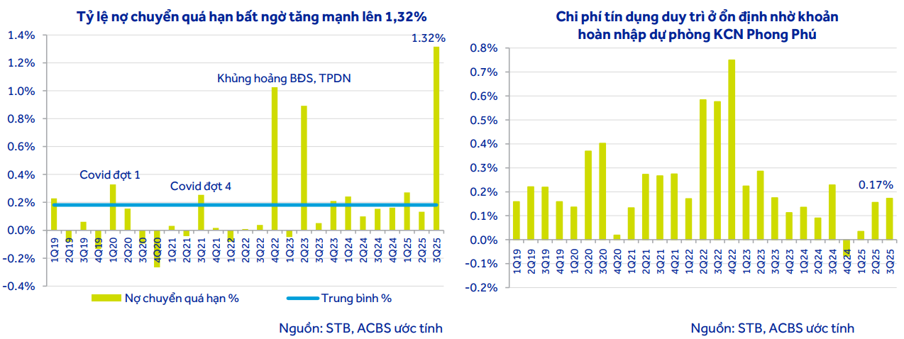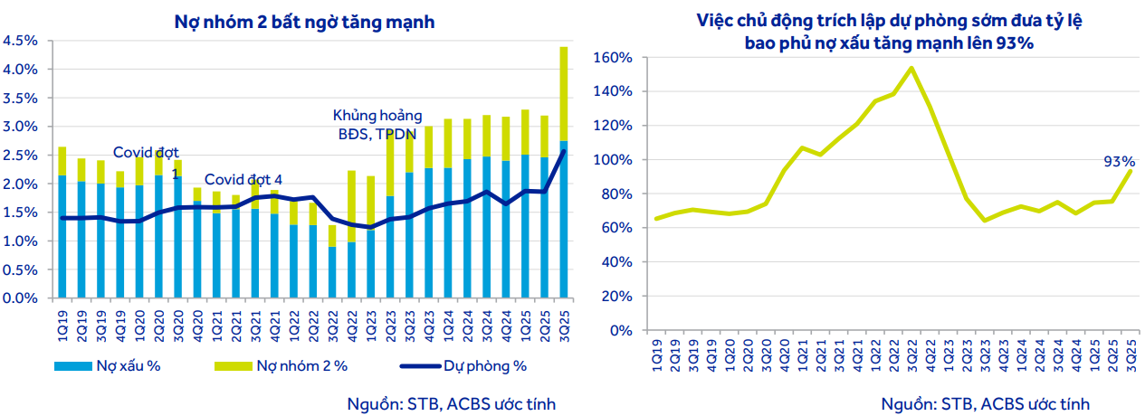 Tỷ lệ nợ xấu tăng lên 2.75%, tương đương tăng 29 điểm cơ bản so với quý trước. Nợ nhóm 2 tăng mạnh lên 1.64%, tăng 91 điểm cơ bản, chủ yếu do nhóm doanh nghiệp xuất khẩu sang Mỹ gặp ảnh hưởng bởi thuế quan, trong bối cảnh ngân hàng đẩy mạnh xử lý nợ thay vì tiếp tục cơ cấu. Đây là rủi ro cần theo dõi sát khi bước sang quý cuối năm.