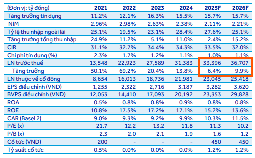 Năm 2026: LNST sau lợi ích CĐTS ước đạt 28,159 tỷ đồng (+6.6% so với 2025). Lợi nhuận tăng trưởng chậm lại do chi phí dự phòng tăng mạnh 34.8% (tăng trở lại mức bình thường sau khi LLR ổn định ở mức 100%), bù đắp một phần bởi sự phục hồi của Thu nhập lãi ròng (NII) 18.3%.