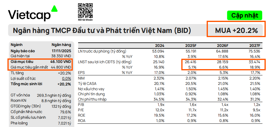 Vietcap (17.11.2025) duy trì khuyến nghị MUA đối với cổ phiếu Ngân hàng TMCP Đầu tư và Phát triển Việt Nam (BID) và điều chỉnh tăng nhẹ 2.9% giá mục tiêu lên 46,100 đồng/cổ phiếu (cuối năm 2026). Vietcap kỳ vọng BID sẽ ghi nhận tăng trưởng LNST sau lợi ích CĐTS đạt 5% trong năm 2025 và đạt tốc độ tăng trưởng kép (CAGR) gần 16% trong giai đoạn 2026-2030, được dẫn dắt bởi tăng trưởng tín dụng bền vững và chất lượng tài sản ổn định.