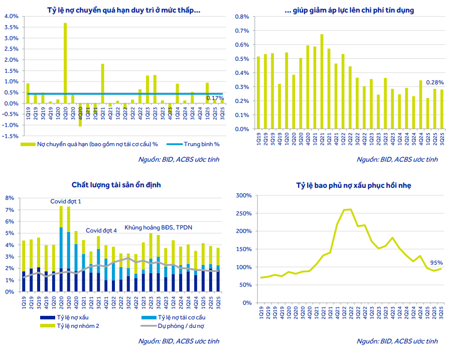 - Chất lượng tài sản cải thiện: NPL quý 3/2025 giảm còn 1.87%, mục tiêu đưa xuống dưới 1.6% cuối năm, LLR dự kiến đạt 100%; BID đặt kế hoạch thu hồi nợ xấu 12–13 nghìn tỷ trong năm.