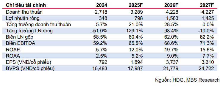 VDSC dự phóng Lợi nhuận sau thuế cổ đông mẹ (LNST-CĐM) năm 2025 và 2026 của HDG lần lượt đạt 942 tỷ đồng (tăng 170% YoY) và 1,322 tỷ đồng (tăng 40% YoY). Sự tăng trưởng mạnh mẽ này được hỗ trợ bởi việc bán và bàn giao bất động sản, không còn trích lập dự phòng phải thu như trong năm 2024, và chi phí lãi vay giảm do nợ gốc giảm dần đều.