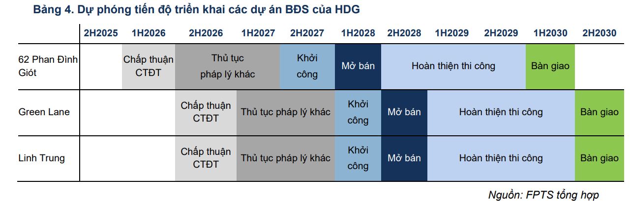 Tái Triển khai Dự án BĐS: HDG đang có tiến triển trong việc triển khai trở lại 3 dự án BĐS62 Phan Đình Giót, Green Lane và Linh Trung nhờ cơ chế thí điểm Nhà Ở Thương Mại (NOTM) trên đất khác. Mặc dù tiến độ bị dự phóng kéo dài thêm 6 tháng, các dự án này dự kiến sẽ được phê duyệt Chủ trương đầu tư và khởi công trong giai đoạn 2026-2028, mở ra nguồn doanh thu lớn trong tương lai.