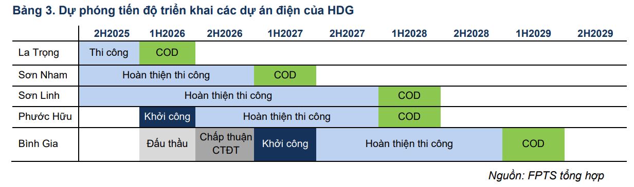 Mở rộng Công suất Điện: HDG đang đẩy mạnh xây dựng 3 nhà máy thủy điện mới với tổng công suất đang được triển khai gồm La Trọng (22 MW, dự kiến hoạt động đầu năm 2026) và Sơn Linh, Sơn Nham (24 MW, dự kiến vận hành 2027 và 2028). Đồng thời, công ty chuẩn bị triển khai các dự án điện gió Phước Hữu (50 MW, COD năm 2028) và Bình Gia (80 MW, COD năm 2029).