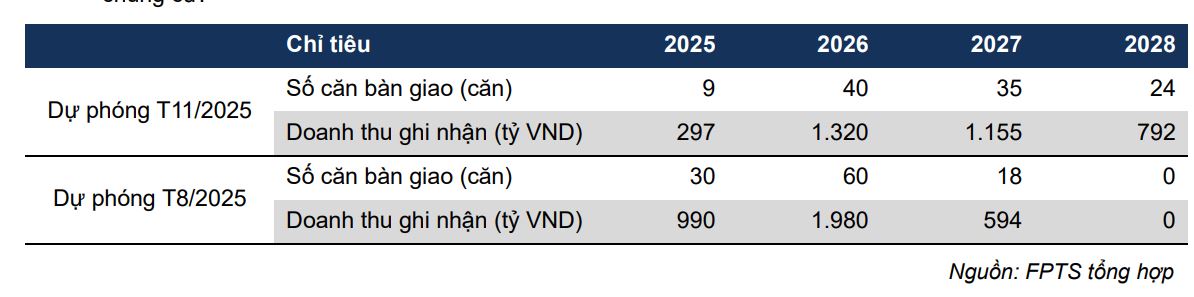 Mảng BĐS bị kéo giãn tiến độ: Dự phóng doanh thu mảng BĐS năm 2025 giảm 70% so với báo cáo tháng 8/2025 (chỉ đạt 297 tỷ VND) do tiến độ bán hàng thực tế tại dự án Charm Villas chậm hơn kỳ vọng. Tỷ lệ hấp thụ thấp tại dự án này được lý giải bởi sản phẩm có giá trị cao, đợt mở bán cuối thường kém hấp thụ và phân khúc biệt thự, liền kề tại Hà Nội phục hồi chậm. FPTS dự kiến việc bàn giao Charm Villas sẽ được kéo giãn sang giai đoạn 2026-2028 (tăng số căn bàn giao năm 2026-2027 và giảm năm 2025).