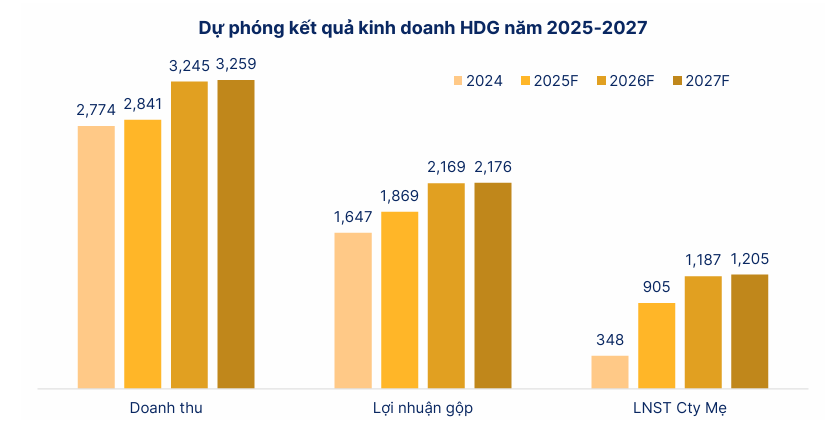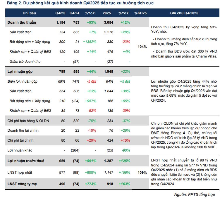 Nhờ kết quả tích cực trong quý cuối năm, FPTS kỳ vọng HDG sẽ hoàn thành và vượt nhẹ kế hoạch kinh doanh năm 2025 với doanh thu dự phóng đạt 3.054 tỷ VND và LNST hợp nhất đạt 1.147 tỷ VND (tương đương $104\%$$109\%$ kế hoạch năm 2025).