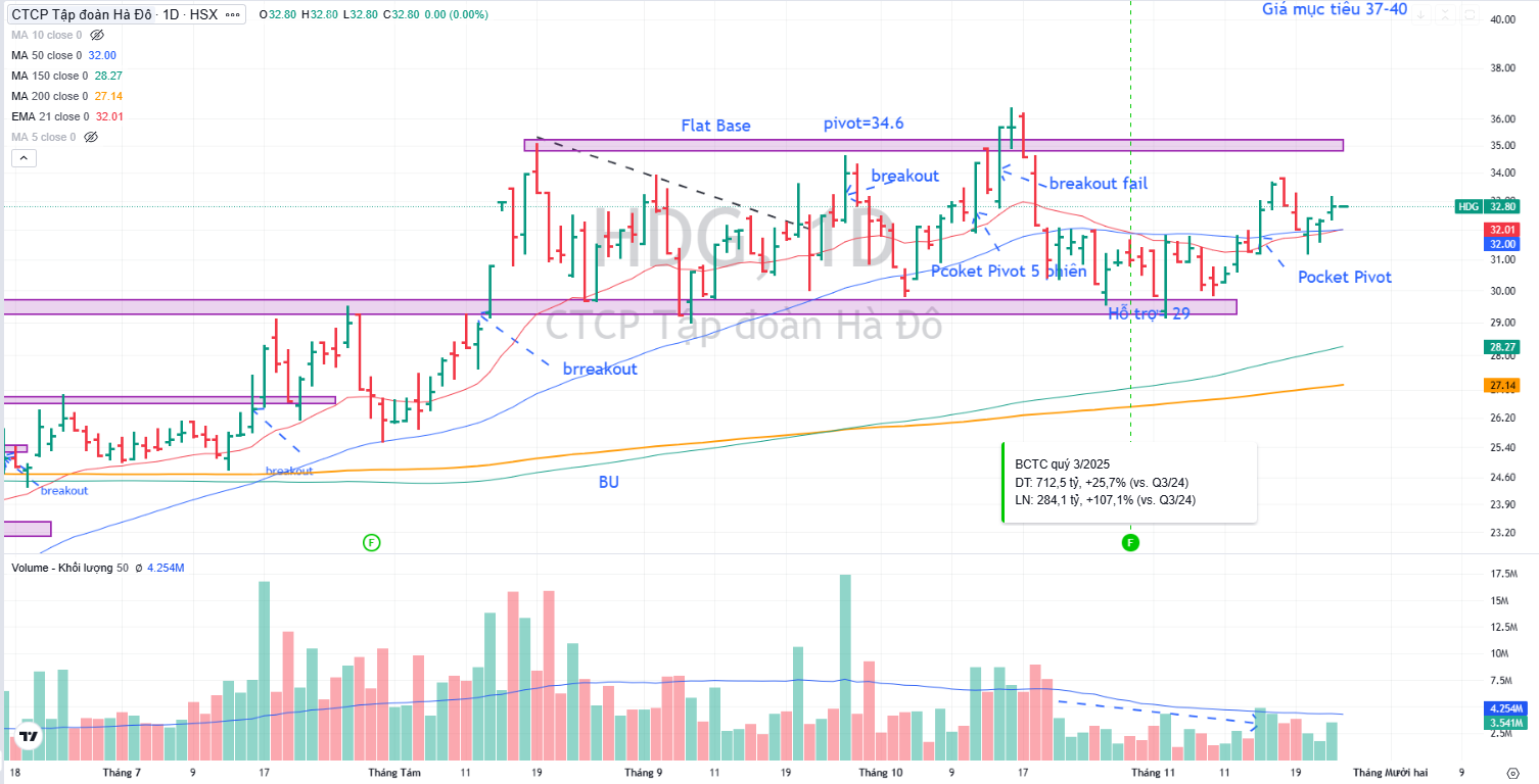 Sau khi khuyến nghị mua HDG ở vùng hỗ trợ 29,000, Elibook Team khuyến nghị mua bổ sung ở điểm mua Pocket Pivot ngày 14.11.2025. Giá hiện đang ở quanh điểm mua này (32,000 đồng).