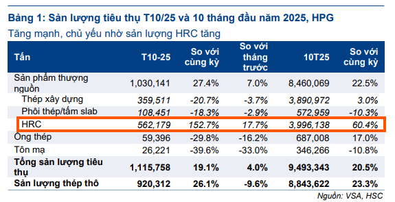 HRC tiếp tục giữ vai trò là động lực tăng trưởng chính của HPG. Trong tháng 10, sản lượng tiêu thụ HRC tăng vọt 153% so với cùng kỳ và 18% so với tháng trước, đạt 562,179 tấn. Lũy kế 10 tháng đầu năm 2025, HPG đã tiêu thụ gần 4 triệu tấn HRC, tăng 60.4% so với cùng kỳ năm trước.