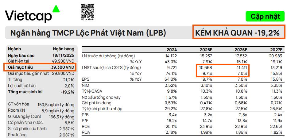 Mặc dù Ngân hàng TMCP Lộc Phát Việt Nam (LPB) đã ghi nhận những cải thiện tích cực về hiệu quả hoạt động, đặc biệt là trong quý 3/2025, nhưng công ty chứng khoán Vietcap vẫn bày tỏ sự thận trọng về mức định giá hiện tại của cổ phiếu này so với triển vọng tăng trưởng lợi nhuận trong tương lai.