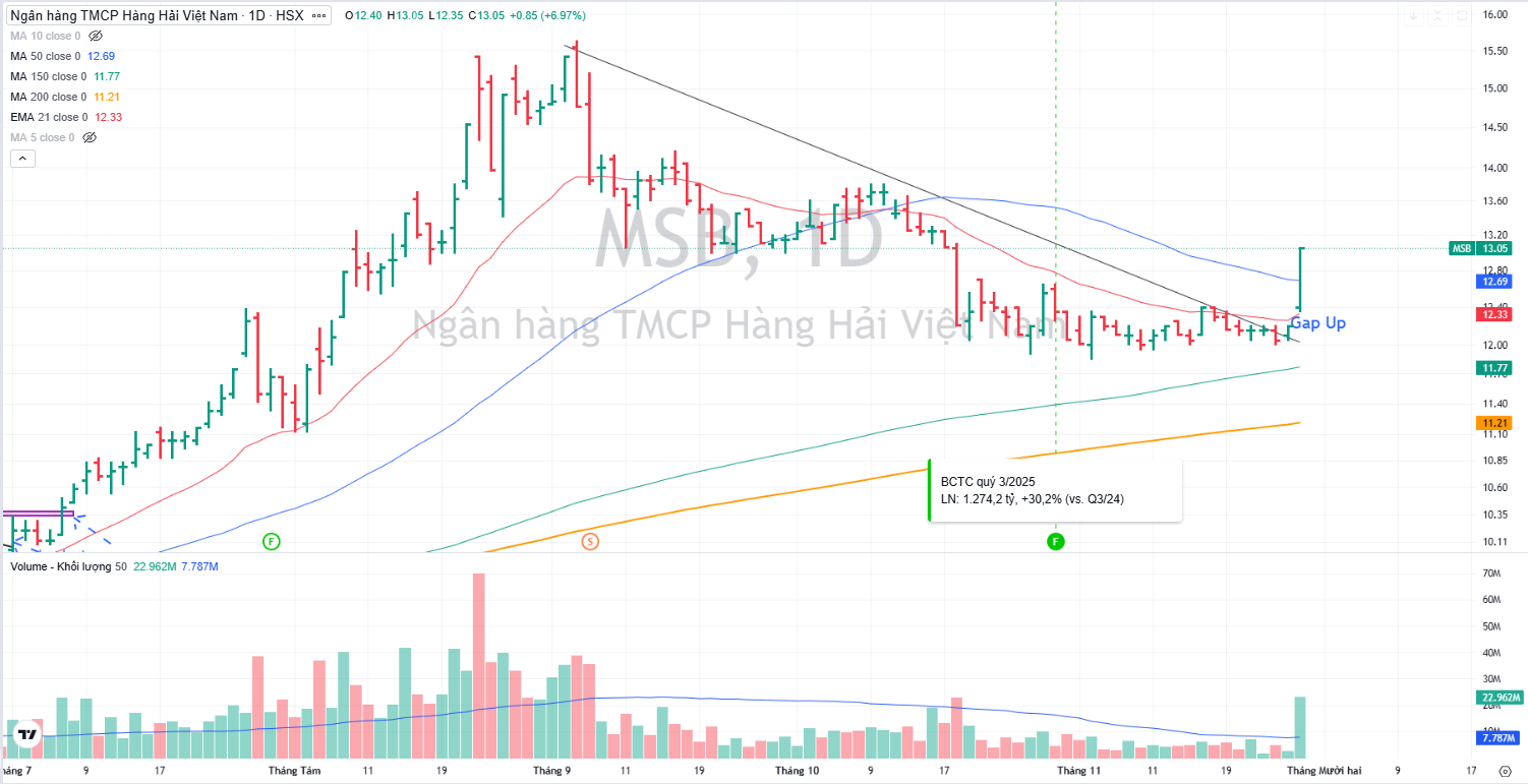 Tuy nhiên, thông tin thoái vốn của VNPT lại trùng với thời điểm cổ phiếu MSB có điểm mua Gap Up vào ngày 27.11.2025.