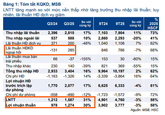 LNTT quý 3/2025 tăng 31% YoY lên ~1,600 tỷ đồng, nhờ nền thấp năm trước và tăng trưởng tín dụng mạnh (+15.9% YTD), NIM cải thiện nhẹ; tuy nhiên lãi thuần dịch vụ giảm 46% khiến kết quả chưa đạt kỳ vọng.