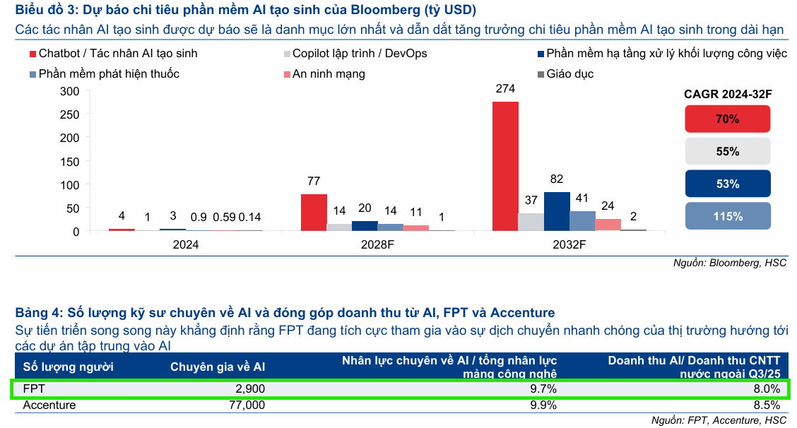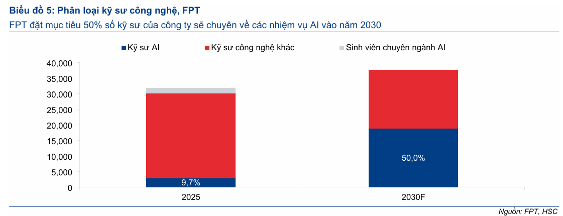 FPT, lựa chọn hàng đầu của HSC, đang tăng cường năng lực AI thông qua hợp tác với các đối tác lớn như Nvidia, Mila và Landing AI, đồng thời đẩy mạnh chuyển dịch sang các quy trình phát triển mặc định ứng dụng AI. FPT đang định vị bản thân trở thành đối tác chiến lược cho các doanh nghiệp toàn cầu tìm cách công nghiệp hóa AI tạo sinh và thúc đẩy tăng năng suất trên toàn tổ chức. Ngoài ra, sự ổn định trở lại của thị trường quốc tế, đặc biệt là sự nối lại các hợp đồng chiến lược tại châu Á-Thái Bình Dương, cũng sẽ thúc đẩy đà phục hồi cho FPT trong năm 2026.