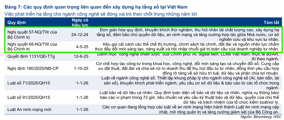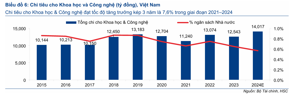 Nghị quyết 57 của Quốc hội đặt nền tảng pháp lý và chính trị quan trọng, củng cố bằng nguồn ngân sách hỗ trợ đáng kể, với mục tiêu chi tối đa 3% tổng chi ngân sách Nhà nước hằng năm cho Khoa học và Công nghệ đến năm 2030, tăng mạnh so với mức bình quân trước đó. HSC kỳ vọng định hướng này sẽ tạo tác động tích cực đối với FPT và CMG.