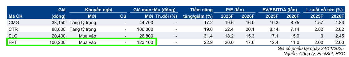 FPT là lựa chọn hàng đầu của HSC với giá mục tiêu 123,100 đồng (tiềm năng tăng giá 23%), đang giao dịch ở mức P/E trượt dự phóng 1 năm là 17.2 lần, rẻ hơn so với bình quân 3 năm. HSC dự báo tăng trưởng doanh thu của FPT sẽ tăng tốc, đạt 12.6% trong năm 2026, được hỗ trợ bởi khả năng của mảng dịch vụ CNTT nước ngoài và việc Chính phủ đẩy mạnh đầu tư vào hạ tầng số trong nước.
