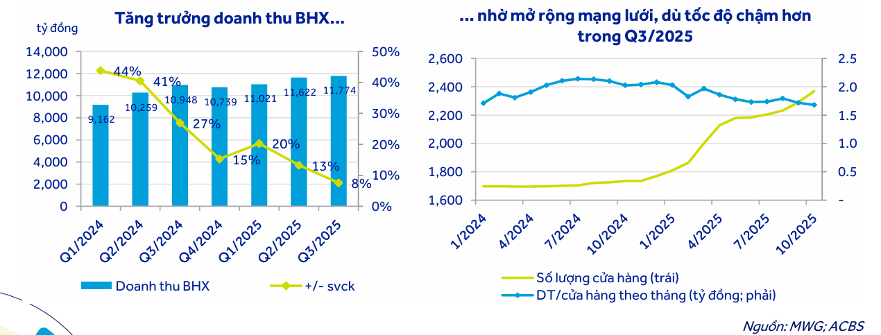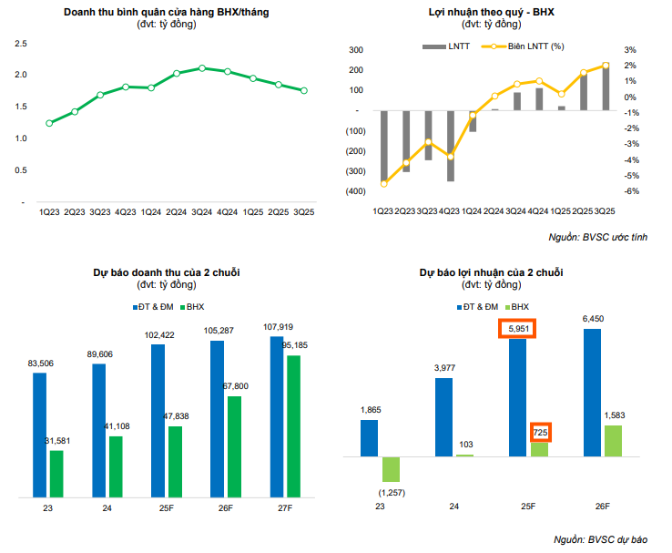 Về triển vọng Quý 4 và cả năm 2025, BVSC cho biết doanh thu tháng 10 đạt hơn 14,800 tỷ đồng (tăng 28% so với cùng kỳ), trong đó ĐT – ĐM tăng 34% và BHX tăng 14%. Dựa trên đà này, BVSC dự báo doanh thu Quý 4 đạt 40,642 tỷ đồng (tăng 18% so với cùng kỳ) và LNST-CĐTS đạt 1,546 tỷ đồng (tăng 83% so với cùng kỳ).