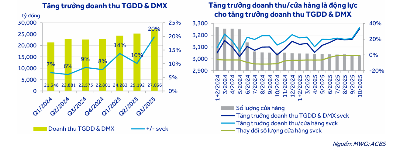 ACBS (28.11.2025) xác định giá mục tiêu cho MWG đến cuối năm 2026 là 91,000 đồng/cổ phiếu. Luận điểm đầu tư được củng cố bởi sự phục hồi mạnh mẽ của TGDD & DMX, việc BHX đạt mục tiêu lợi nhuận và tiềm năng tăng trưởng từ các chuỗi mới và hoạt động tái cấu trúc hiệu quả.