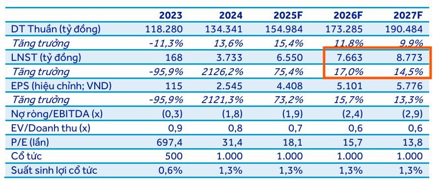 Đối với năm 2026, ACBS dự phóng tăng trưởng doanh thu và LNST lần lượt ở mức 11.8% và 17% yoy.