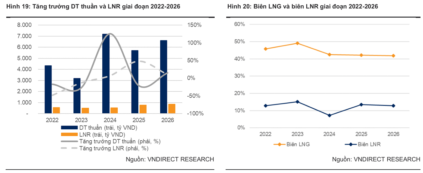 VNDirect dự phóng DT hợp nhất của NLG sẽ giảm 21% trong năm 2025 (do không còn hợp nhất dự án Izumi từ Q4/2025) trước khi phục hồi 16% vào năm 2026. Ngược lại, LNR được kỳ vọng tăng mạnh 48% trong năm 2025, đạt 766 tỷ đồng và tăng 10% trong năm 2026, đạt 842 tỷ đồng. Đáng chú ý, LNR năm 2025 sẽ được thúc đẩy bởi khoản lợi nhuận tài chính bất thường khoảng 331 tỷ đồng (tương đương 55% LNR năm 2025) từ việc bán 15.1% cổ phần tại dự án Izumi cho đối tác Tokyu Nhật Bản, giảm tỷ lệ sở hữu xuống còn 50%. Sức khỏe tài chính của NLG được đánh giá cao, với tỷ lệ nợ trên Vốn Chủ Sở Hữu (VCSH) dự kiến duy trì ở mức thấp trong năm 2025-2026, được hỗ trợ bởi hoạt động bán hàng tích cực, nguồn vốn thu về từ đợt phát hành cổ phiếu mới (~2,500 tỷ đồng) và giao dịch Izumi.