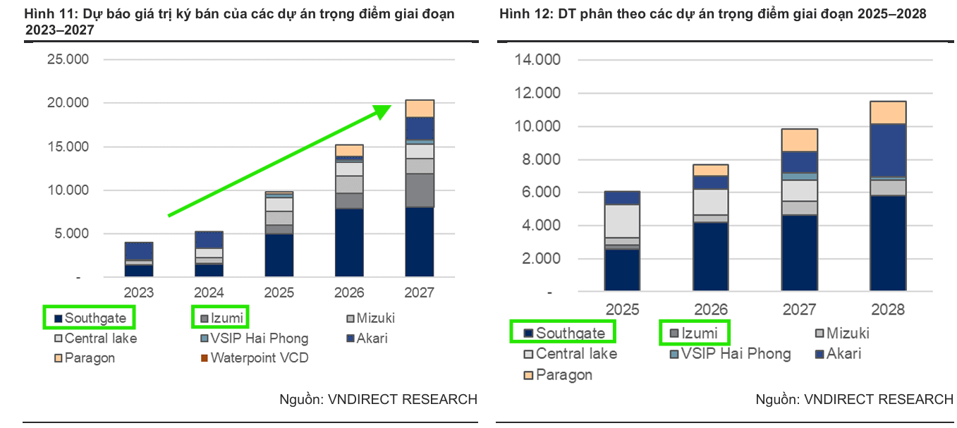 | Luận điểm/Động lực Tăng trưởng Chính | Hưởng lợi từ làn sóng đầu tư hạ tầng (Vị trí dự án gần hạ tầng trọng điểm). Doanh số bán hàng vượt kỳ vọng. Sức khỏe tài chính tốt. | Chất lượng quỹ đất sạch, đã thanh toán TSDĐ. Doanh số bán hàng mạnh mẽ tại Southgate, Mizuki, Izumi, Paragon. | Quỹ đất sạch dồi dào, pháp lý hoàn chỉnh. Bàn giao backlog lớn. Bán hàng mới tại Izumi, Paragon. | Giá cổ phiếu đã điều chỉnh 13%, tạo cơ hội đầu tư. Hưởng lợi từ phục hồi BĐS phía Nam. |