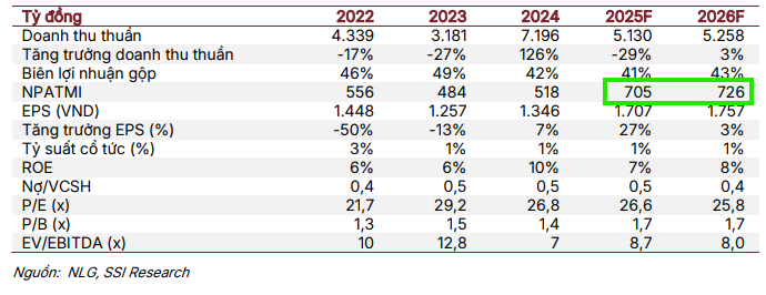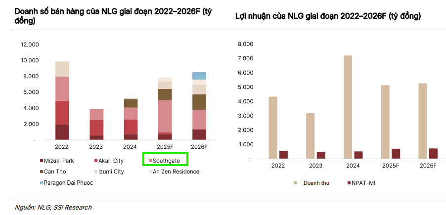 Nhờ cơ cấu sản phẩm phù hợp nhu cầu thị trường, hạ tầng cải thiện và đà phục hồi của thị trường bất động sản phía Nam, SSI dự báo doanh số bán hàng cả năm 2025 của NLG sẽ đạt 7,8 nghìn tỷ đồng, tăng 51% so với năm trước. Sang năm 2026, doanh số dự phóng tiếp tục tăng 9% lên mức 8,5 nghìn tỷ đồng, được hỗ trợ thêm bởi dự án Paragon Đại Phước dự kiến mở bán, củng cố danh mục dự án và vị thế của NLG trên thị trường.