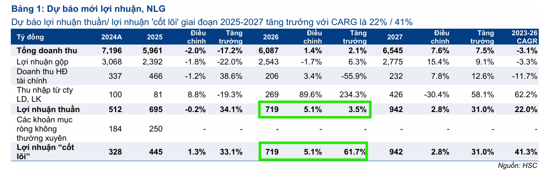 Đối với giai đoạn 2026-2027, HSC đã tăng 3-5% dự báo lợi nhuận thuần lên 719 tỷ đồng và 942 tỷ đồng, chủ yếu nhờ lợi nhuận hoạt động tài chính được cải thiện sau khi NLG huy động thành công 2,500 tỷ đồng từ đợt phát hành quyền mua vào tháng 12/2025. Lợi nhuận trong giai đoạn này chủ yếu đến từ việc bàn giao các dự án Mizuki, Izumi, Paragon, Southgate, Anzen và Cần Thơ.