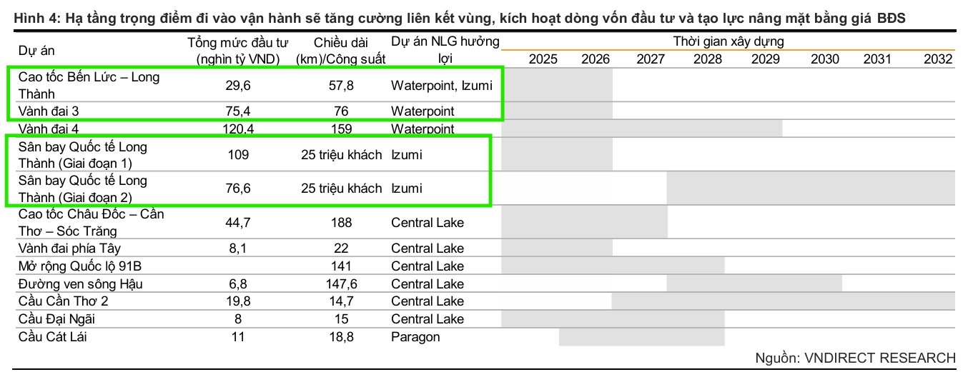 Các dự án của NLG, đặc biệt là các dự án lớn như Waterpoint (Southgate), Mizuki Park và Izumi City, tọa lạc gần các tuyến hạ tầng trọng điểm. Việc đẩy mạnh hoàn thiện các dự án cơ sở hạ tầng (nhằm tăng cường kết nối giữa TP.HCM với các tỉnh vệ tinh như Long An, Đồng Nai, và Đồng bằng sông Cửu Long) sẽ thúc đẩy mạnh mẽ kết nối khu vực, thu hút dòng vốn FDI và kích thích cả nhu cầu đầu tư dài hạn lẫn nhu cầu nhà ở thực. Cơ sở hạ tầng được cải thiện cũng được kỳ vọng sẽ tiếp tục đẩy giá BĐS, hỗ trợ giá trị bán trước và doanh thu.