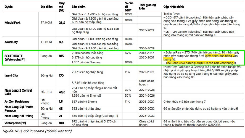 - Tại dự án Southgate (Tây Ninh), NLG đã mở bán The Pearl và đạt hơn 2,000 tỷ đồng doanh số bán nhà chỉ trong 2.5 tháng, nâng tổng doanh số Southgate từ đầu năm lên khoảng 4,200 tỷ đồng, vượt dự báo trước đó của HSC.