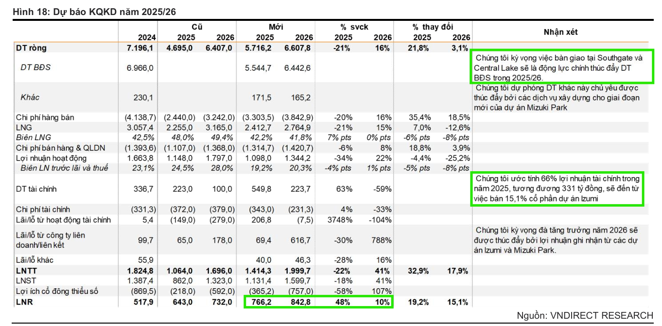 Theo dự báo mới nhất, NPATMI cả năm 2025 dự kiến đạt 705 tỷ đồng, tăng trưởng 36% so với năm 2024. Trong năm 2026, NPATMI được dự phóng đạt 726 tỷ đồng. Mặc dù mức tăng trưởng tuyệt đối chỉ là 3%, nếu loại trừ khoản lợi nhuận thoái vốn Izumi đột biến trong năm 2025, mức tăng trưởng lợi nhuận cốt lõi của năm 2026 sẽ đạt 36% so với năm trước. Kết quả này sẽ được hỗ trợ bởi hoạt động bàn giao và ghi nhận lợi nhuận mạnh mẽ từ các dự án Southgate, Central Lake và các công ty liên doanh tại Izumi City.