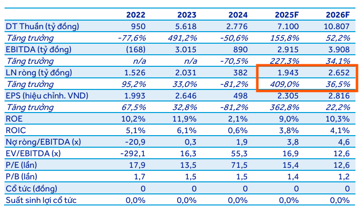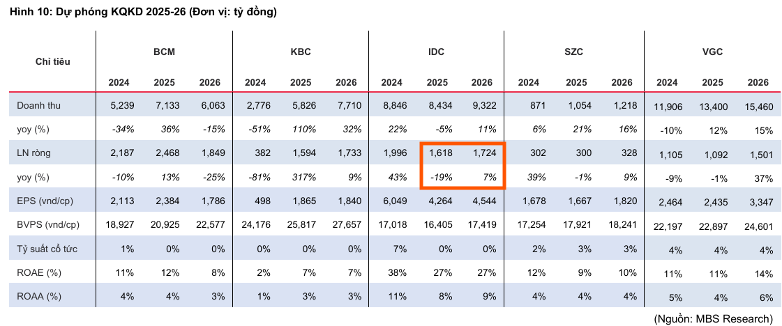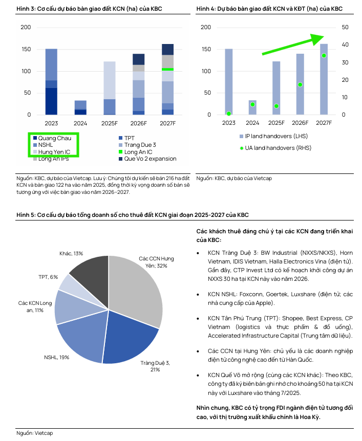 Vietcap dự báo LNST sau lợi ích cổ đông thiểu số (CĐTS) năm 2025 sẽ tăng vọt 331% so với năm trước, đạt 1,600 tỷ đồng, được hỗ trợ bởi việc bàn giao khoảng 17 ha đất KCN từ NSHL trong Quý 4/2025. Tuy nhiên, Vietcap điều chỉnh giảm 3% dự báo LNST năm 2025 do kỳ vọng KCN Tràng Duệ 3 sẽ bắt đầu bàn giao vào năm 2026 thay vì năm 2025 như dự báo trước. ACBS giữ nguyên dự báo bàn giao năm 2025 ở mức 141 ha.